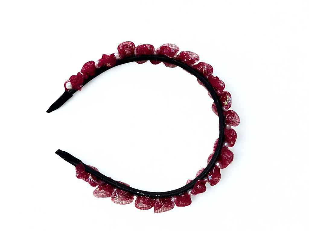 Crafted in a rich maroon hue, this hairband features soft ruffled tulle layered with dainty pearl embellishments β perfect for holiday parties, family dinners, and Christmas celebrations.
