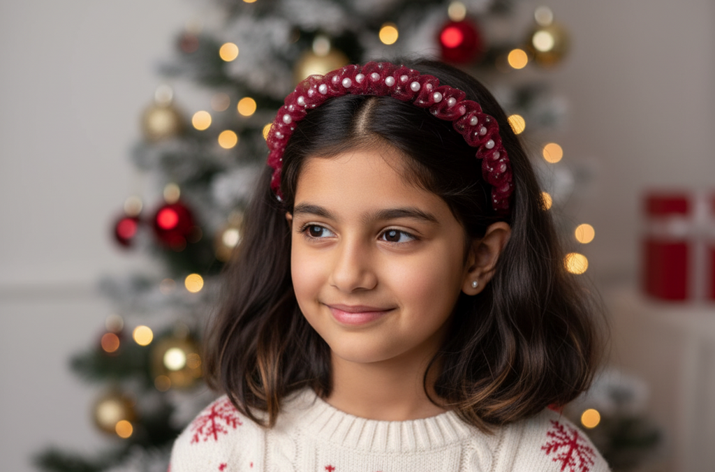 Add an elegant festive touch to your little oneβs look with our Pearl Ruffle Christmas Hairband! β¨