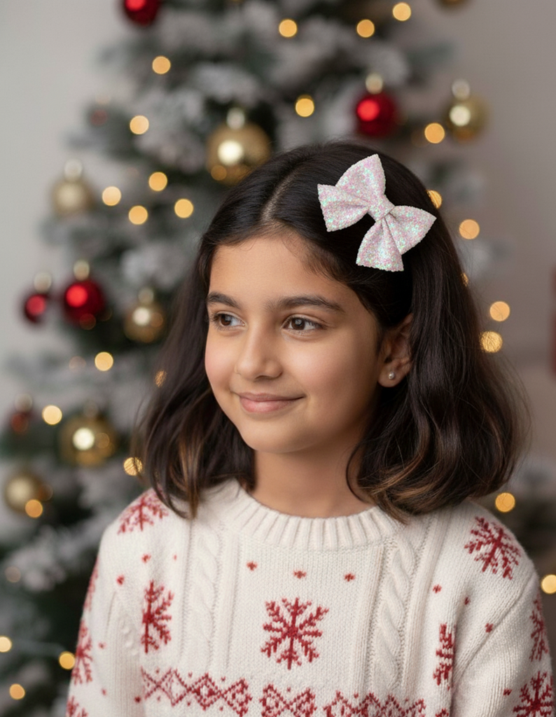 Crafted with dazzling White sequins that catch every glimmer of holiday light, this bow adds the perfect pop of sparkle to any outfit — from cozy Christmas jammies to party dresses.