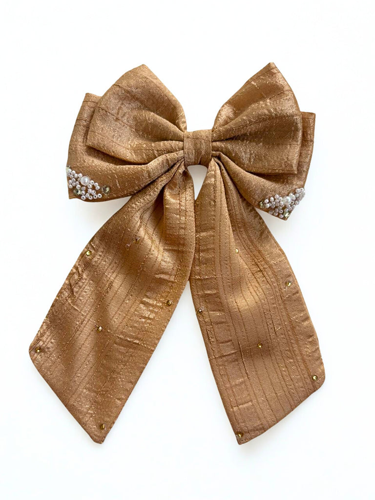 Handcrafted in a rich fabric, this statement bow sparkles with delicate pearl and stone detailing — the perfect touch of festive glamour for Christmas parties, school events, or family celebrations. ✨