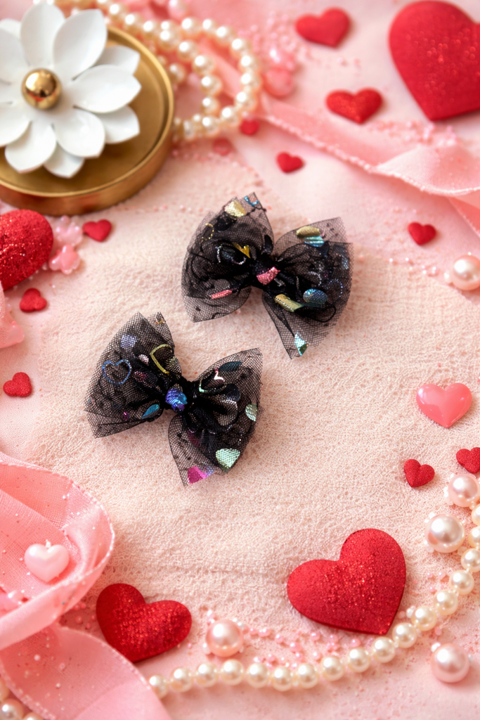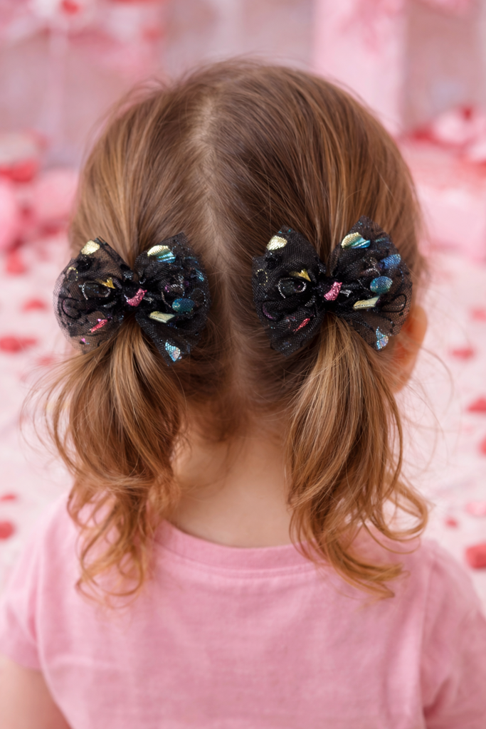 Add a touch of sparkle and fun to your little one’s hairstyle with this adorable set of 2 glitter love alligator clips from Knotty Ribbons. Crafted in elegant black net fabric with colourful glitter heart accents, these bows are perfect for adding charm to both everyday looks and special occasions.