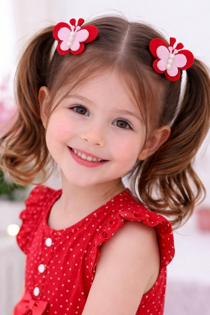 Add a bright and charming touch to your little one’s hairstyle with this Set of 2 Red Butterfly Alligator Clips. Made with soft felt butterfly wings in vibrant red tones and finished with delicate pearl accents, these clips bring a playful yet elegant look. The sturdy alligator clip provides a secure grip, keeping hair neatly in place all day.