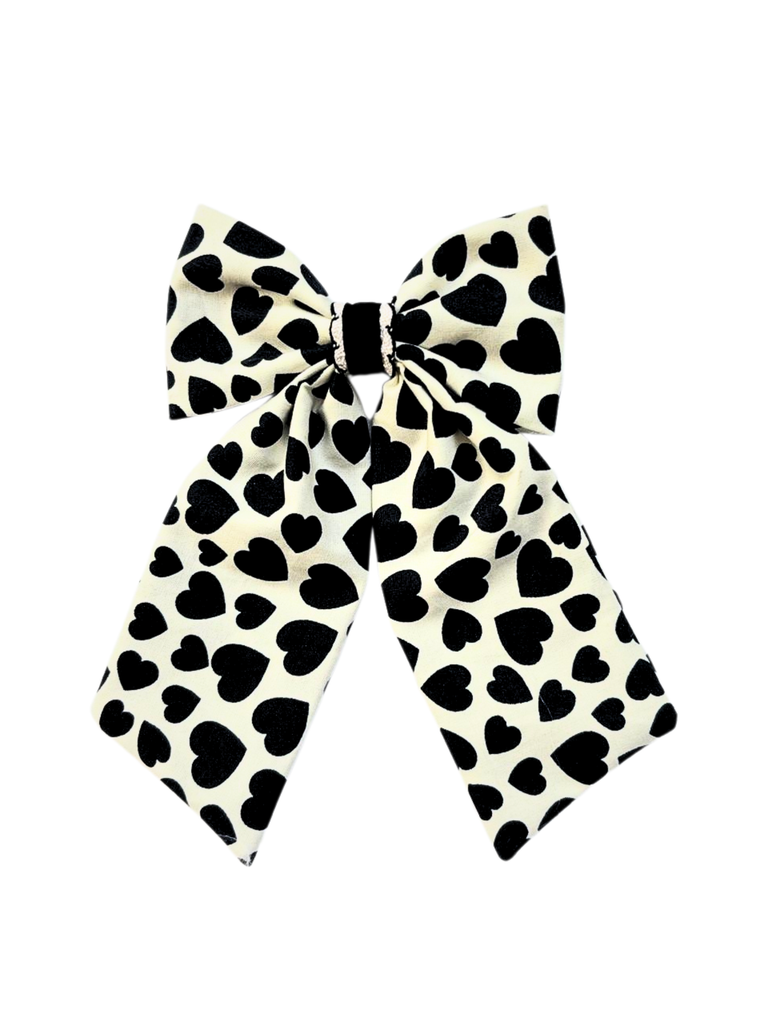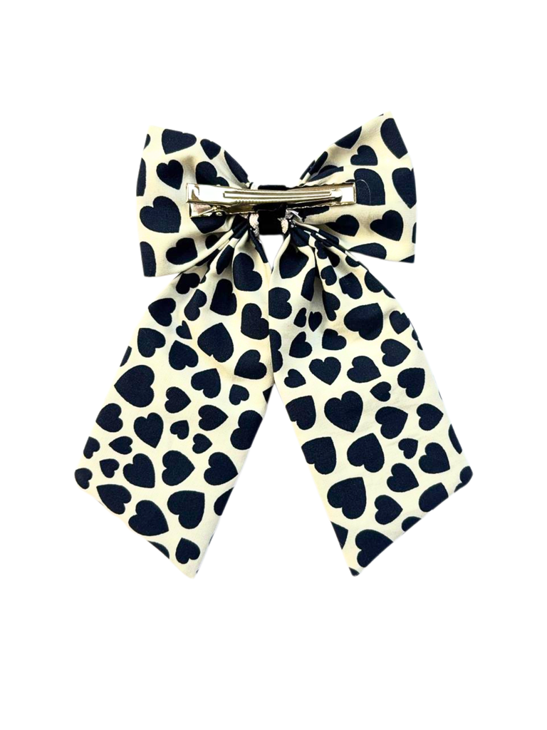Add a touch of elegance and sweetness to your little one’s hairstyle with this beautifully designed heart print bow from Knotty Ribbons. Crafted on a soft white base with classic black heart prints, this bow is finished with a delicate lace detail at the center, giving it a charming and refined look. The long-tail bow design makes it perfect for special occasions as well as stylish everyday wear.