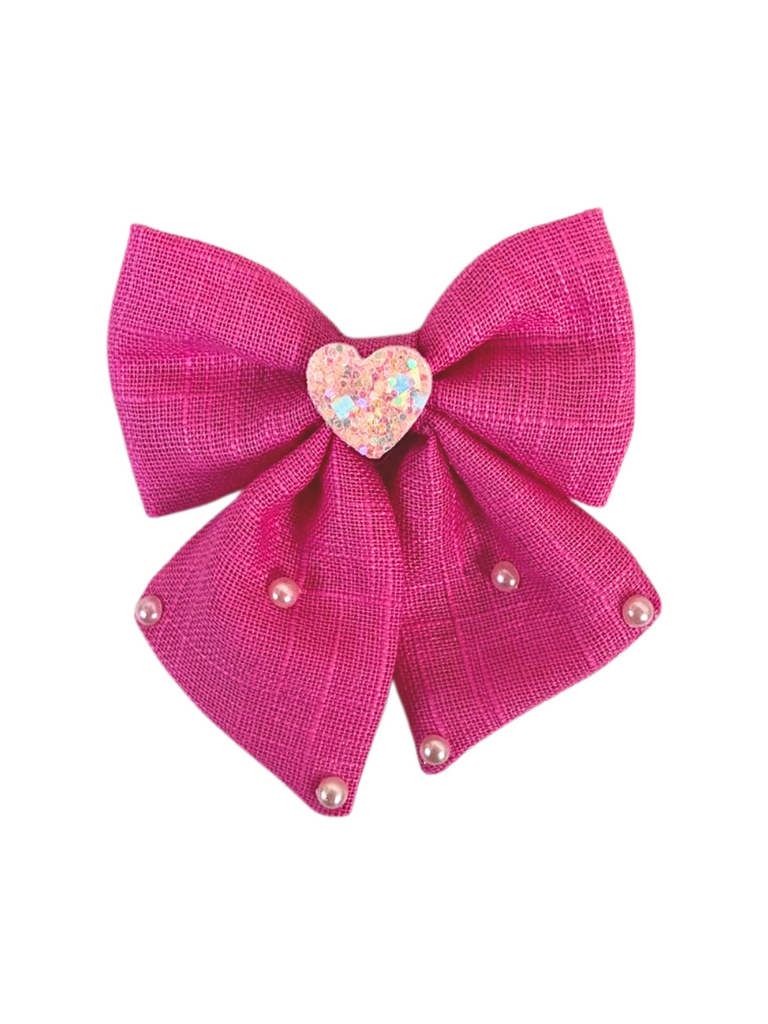 Add a sweet sparkle to everyday hairstyles with this elegant Pink bow alligator clip from Knotty Ribbons. Made with a textured fabric finish, the bow features delicate pearl accents and a shimmering heart detail at the center, giving it a charming yet classy look. Perfect for both casual wear and special occasions, this accessory effortlessly elevates any outfit.
